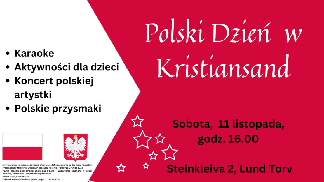 I år vil vi feire Polens uavhengighetsdag igjen i Kristiansand. Men denne gangen vil det være siste gangen vi feirer det i den gjestfrie lokalene på Steinkleiva 2, på Lund Torv. Denne gangen starter vi med en ekte polsk middag. Det vil heller ikke mangle en konsert med vår lokale polske artist Agnieszka Piliszko. Som vanlig vil det være aktiviteter for barn og polsk karaoke. Og selvfølgelig vil det ikke mangle patriotiske polske sanger!